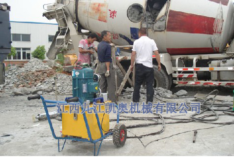 传统方法为人工风镐破碎清理法,特点是效率太低,耗时过长,严重影响混凝土罐车后续的维修与使用效率施工采用1支风枪打孔和一台液压分裂机专用液压动力站、1-2支分裂机配合进行。施工作业时,首先使用风枪在罐车入口处混凝土面上以三角形状钻孔,然后用分裂机对混凝土进行分裂。